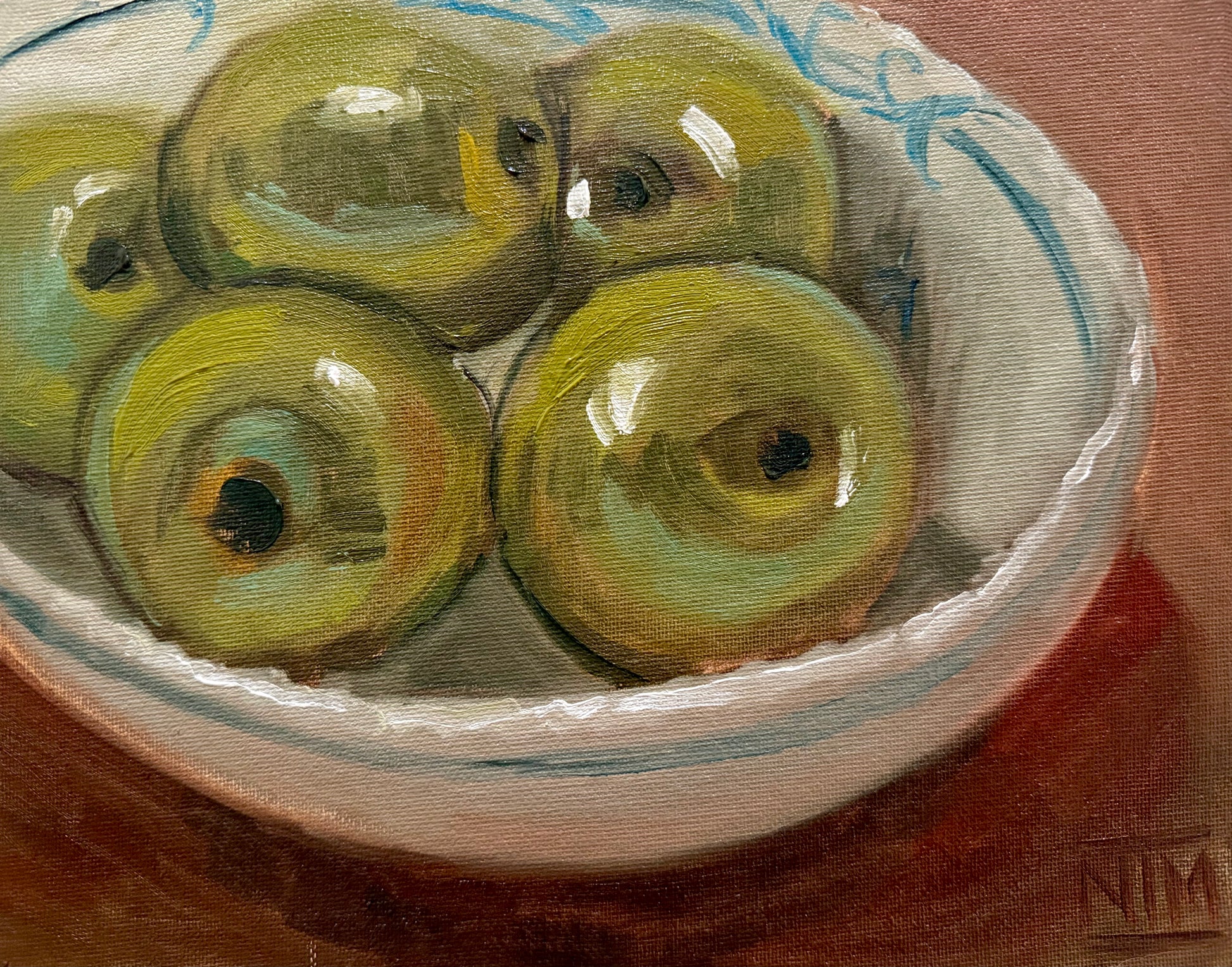 This is a still-life study of green apples in a white bowl with blue decorations.