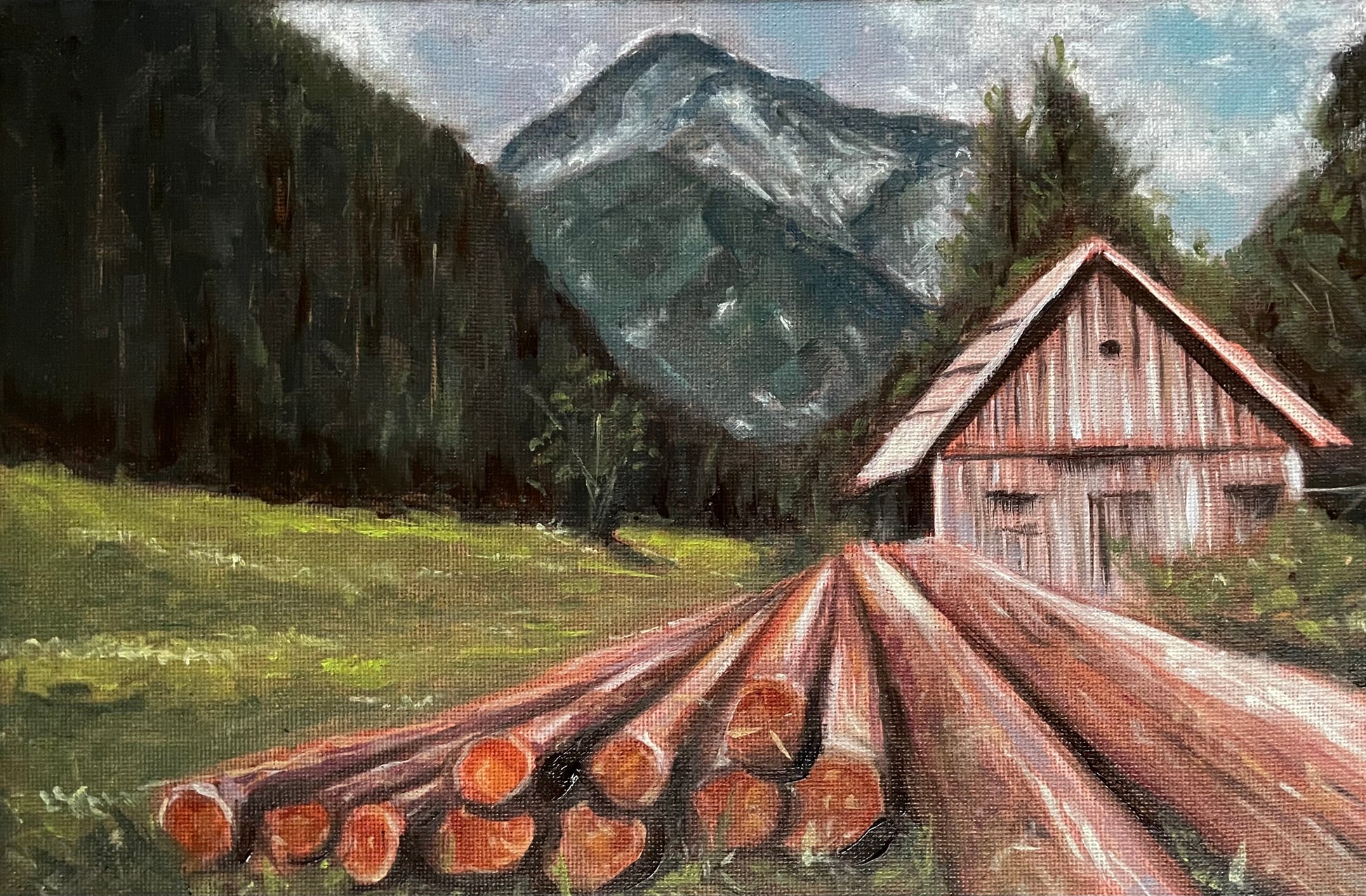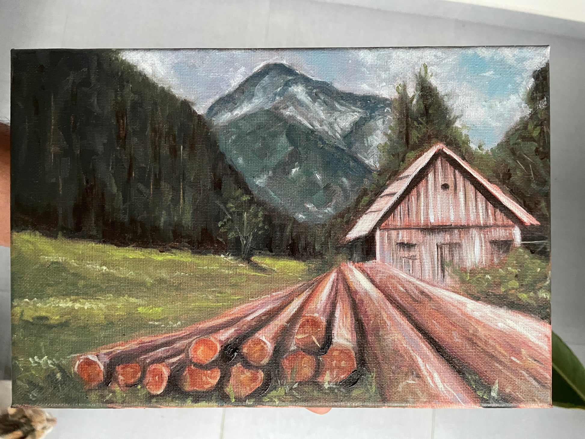 Experience the tranquility and beauty of nature with this original oil painting. Depicting a country house surrounded by logs, grassy fields, and a breathtaking mountain and sky, this piece exudes peace and relaxation. Transform any room into a serene oasis with this stunning landscape oil painting.