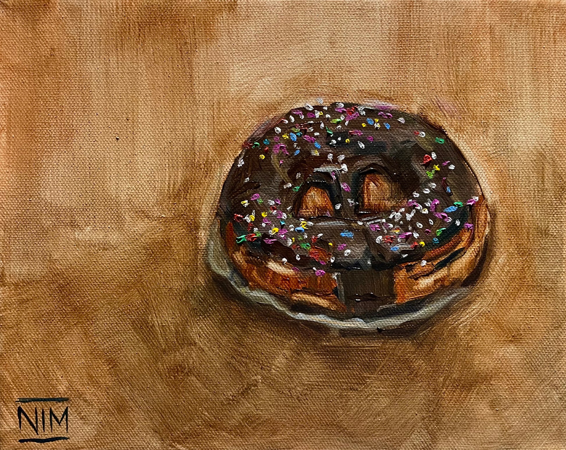 This original oil painting captures a detailed still life of a donut, showcasing expert brushwork and rich, vibrant colors. The textured layers and realistic lighting bring depth and dimension, making it a compelling art piece for collectors and enthusiasts. Perfect for adding a touch of warmth and charm to any space, this artwork exemplifies skilled craftsmanship in traditional oil painting techniques.