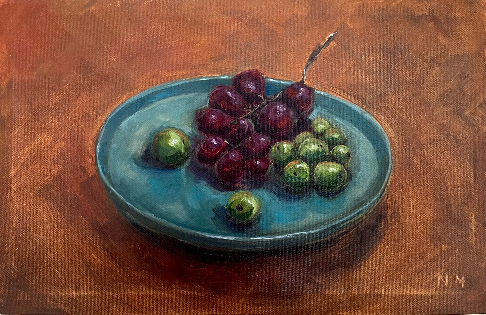 Grapes on a Blue Plate Still Life Original Oil Painting Artwork For Sale
