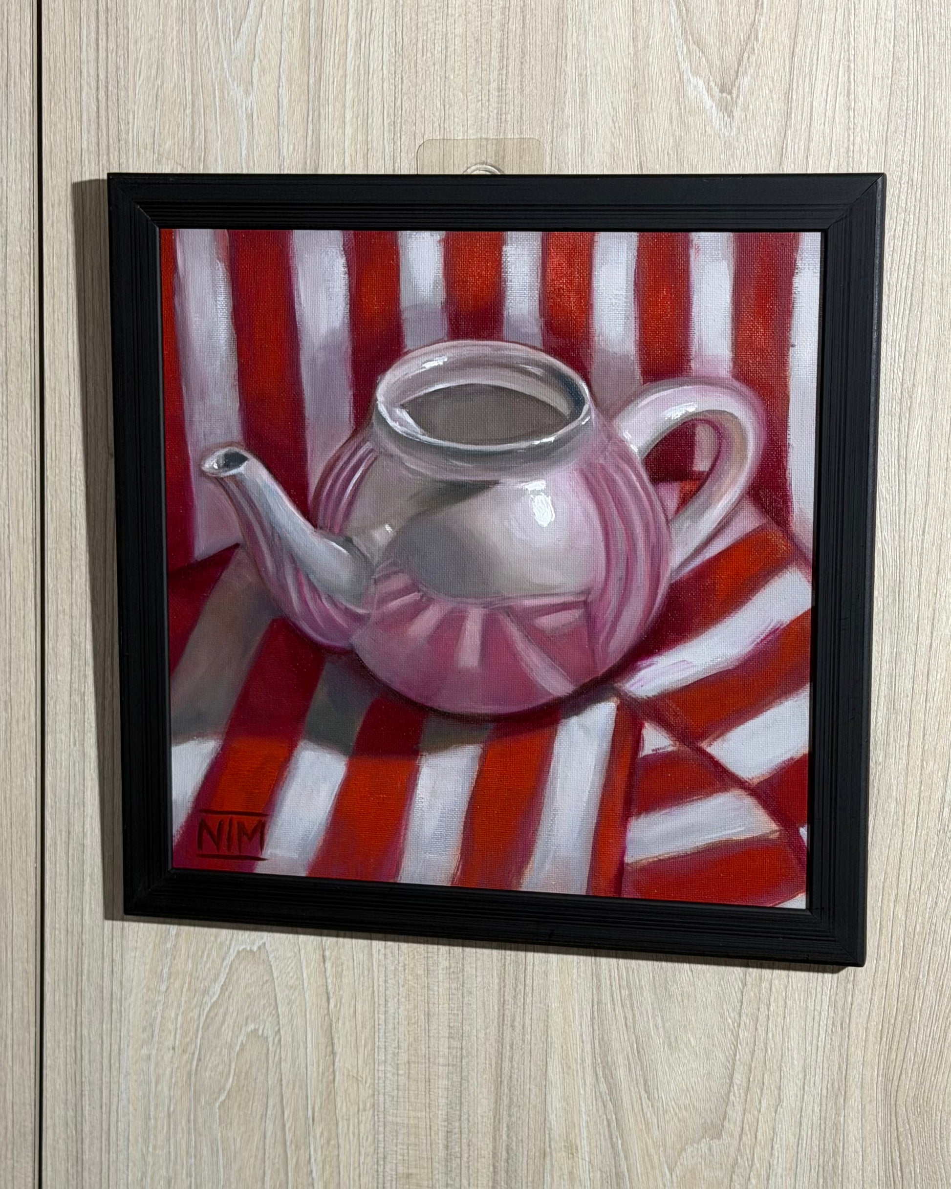 White Teapot on Red Striped Cloth Original Oil Painting Artwork For Sale